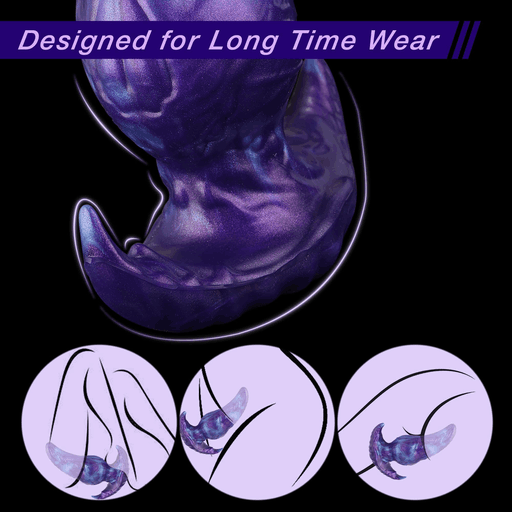 Форма напоминает миниатюрный космический рог или закатную волну с плавными выступами — словно скульптура из фиолетового мрамора с мерцающими голубыми разводами. Поверхность выглядит сатиновой и бархатистой, цвета переливаются от глубокого пурпура до лиловых бликов, создавая эффект «галактической глубины». Основание аккуратно расширено для безопасности и удобного обращения, а общий силуэт — эргономичен и сбалансирован.