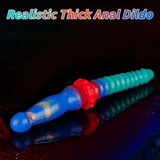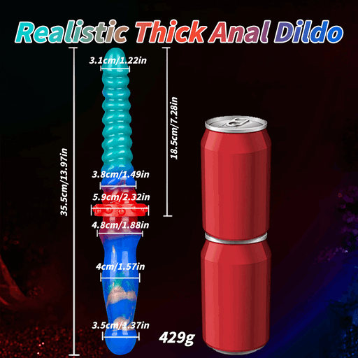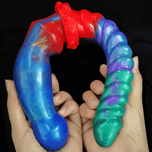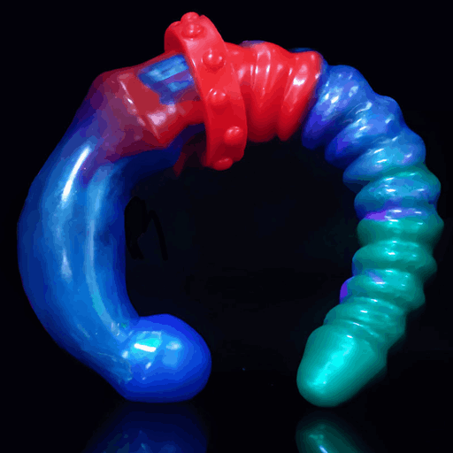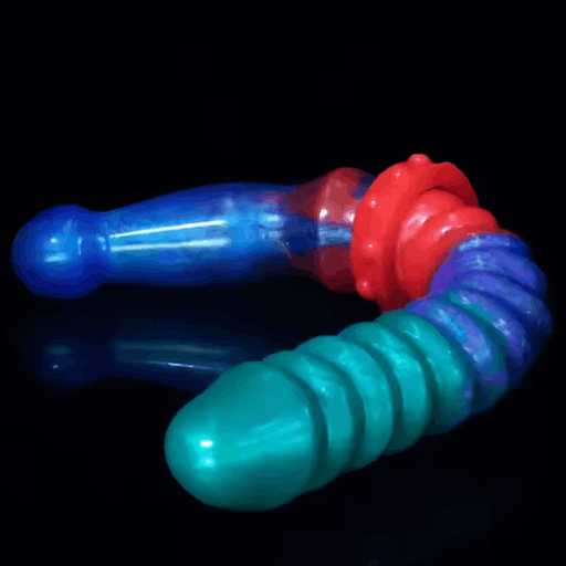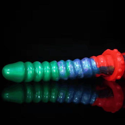 Внешне прибор напоминает яркий межгалактический сувенир: плавный градиент зелёно‑сине‑бирюзовых тонов, играющих друг с другом, как свечения в ночи. Один конец — гладкий и слегка изогнутый, другой — украшен аккуратными, равномерными кольцевыми выступами, которые обещают дополнительную текстуру при контакте. В месте соединения виден массивный, но аккуратный фиксатор‑сустав с «шайбами», будто для верности и длительных приключений. Основание оформлено как присоска для уверенной опоры — маленькая деталь, которая добавляет практичности в эту романтическую фантазию.