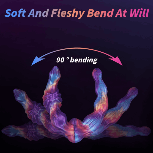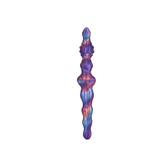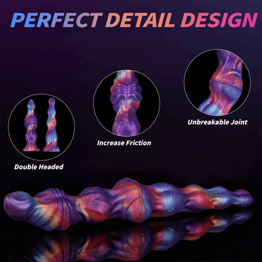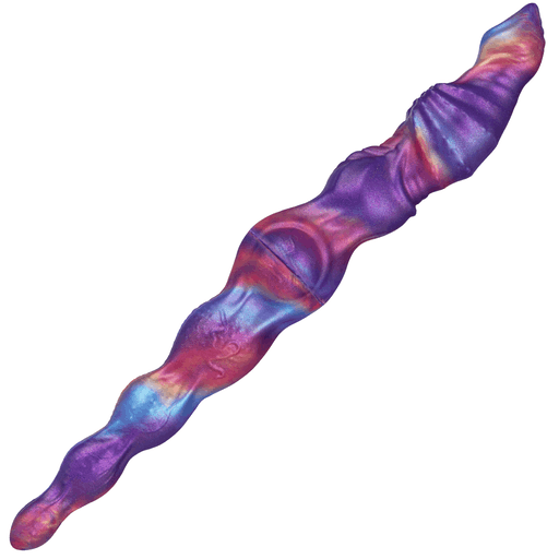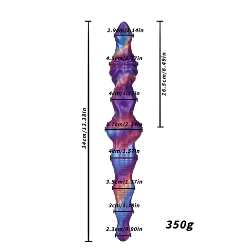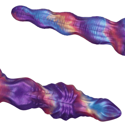 Во внешнем виде Voidweaver сочетается феерия цветов и инопланетная текстура: переливы фиолетового, синего и тёплых огненных тонов словно мазки живописи на бархатном фоне. Форма извилиста и артистична — волнообразные выпуклости, рифлёные «пояски» и аккуратные узлы чередуются, создавая контуры, которые обещают дополнительную тактильную стимуляцию. Конструктивно видно, что изделие двустороннее — два окончания с разной формой, а между ними расположена гибкая, усиленная «шарнирная» зона, обеспечивающая плавный изгиб и надёжность при движении. Текстуры на корпусе предназначены для увеличения трения и чувственности, а глянцевая поверхность силикона подчёркивает глубину цвета, будто вы держите миниатюрную галактику в руках.