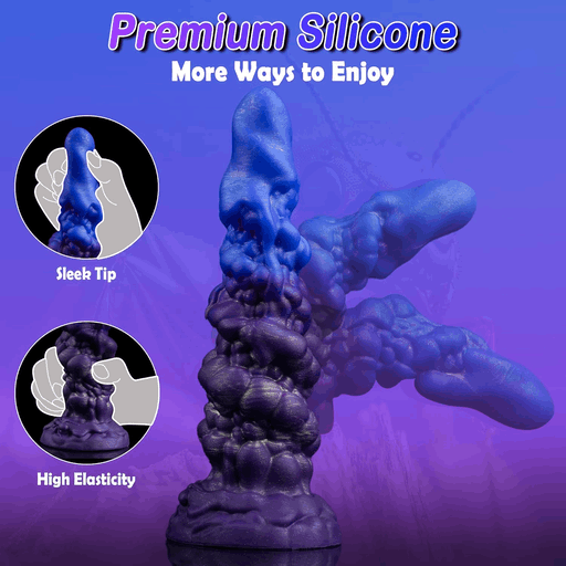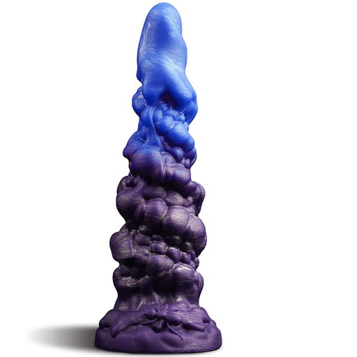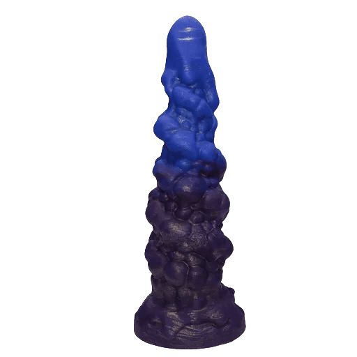 Цветовая гамма — глубокие ягодные тона, от насыщенного голубовато-фиолетового к бархатистому пурпуру, как будто ягодный коктейль встретил ночное небо. Поверхность матово-сияющая, что добавляет игрушке чуть мистического блеска; рельефные спирали и клубки на теле выглядят словно причудливые кораллы, приглашая к изучению пальцами. В целом внешний вид сочетает в себе игривость голубики и хулиганскую нотку «демонического рога» — забавно, сразу возникает образ кокетливого пришельца, пришедшего на свидание.