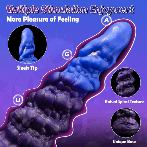 Форма — не просто форма: это небольшое произведение межзвёздного дизайна. Заострённый, аккуратно заглаженный носик позволяет начать знакомство мягко и игриво, а дальше тело переходит в череду бугристых, спиралевидных участков — они играют на нервах и вызывают улыбку от неожиданной текстуры. Основание выполнено в виде своеобразного «уникального пьедестала», который служит и для безопасности, и как удобная точка удержания — романтика и практичность идут рука об руку, словно балет на краю пропасти.