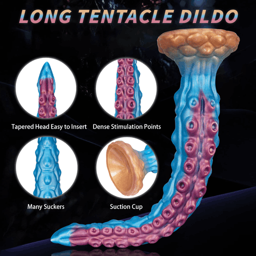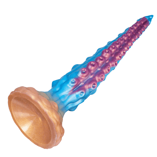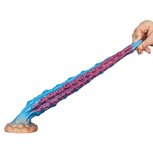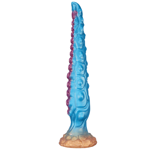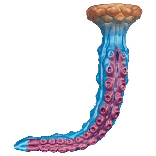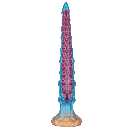 Форма — откровенно инопланетная: вытянутый слегка изогнутый «щупальцеобразный» корпус, где каждая волна и рельеф выглядят так, будто их создала океанская цивилизация с другим чувством юмора. Насечки и ряды «присосок» по всей длине создают эффект текстуры, обещая игривую стимуляцию, а заострённая, сужающаяся головка делает профиль более элегантным и плавным. В основании — широкая «присоска»-опора с интересным рельефом, которая добавляет функциональности и позволяет прикреплять изделие к ровной поверхности для свободных рук. Цветовая гамма — смесь бирюзово-голубого, розоватых и персиковых оттенков, которые словно подсвечены внутренним светом: одновременно забавно и эстетично, как костюм для балета межзвёздных возлюбленных.