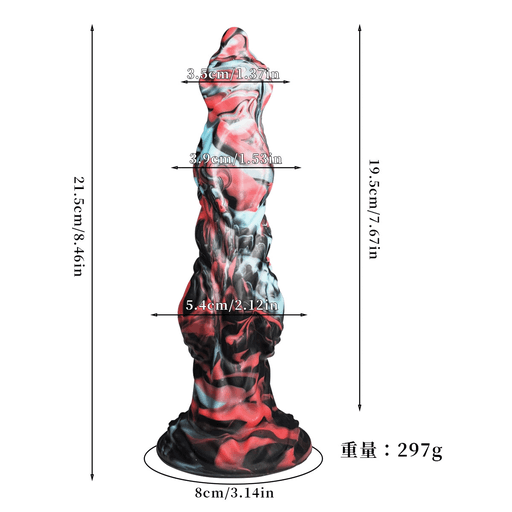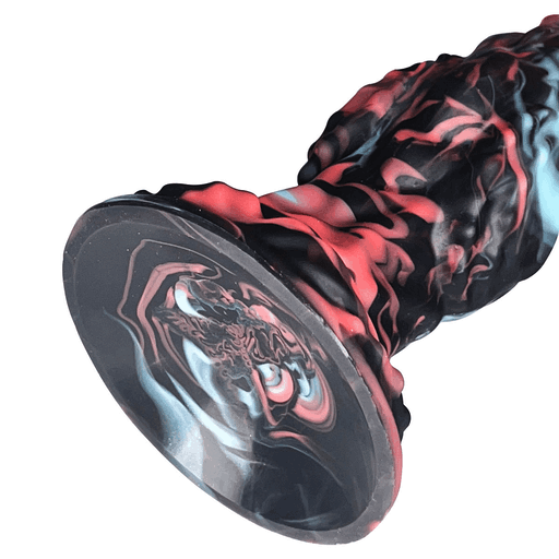 Выглядит он так, будто художник с другой планеты устроил вечеринку красок — плавный мраморный рисунок в черных, кораллово-розовых и бирюзово-голубых тонах переливается по волнообразной поверхности. Форма — органичная, с выступами и плавными изгибами, которые словно созданы для того, чтобы то нежно ласкать, то вызывающе щекотать. В основании — широкая присоска, уверенно удержит игрушку на гладкой поверхности и позволит импровизировать в любых положениях. Взгляд задерживается на деталях: волнообразные бугры, изящные переходы и слегка глянцевая фактура делают Alien McFucker одновременно забавным и притягательно эротичным.