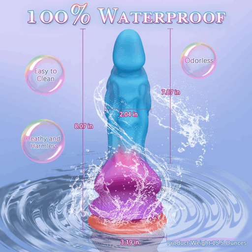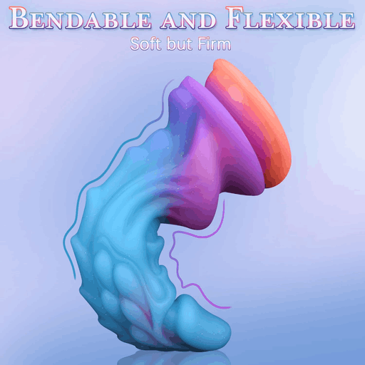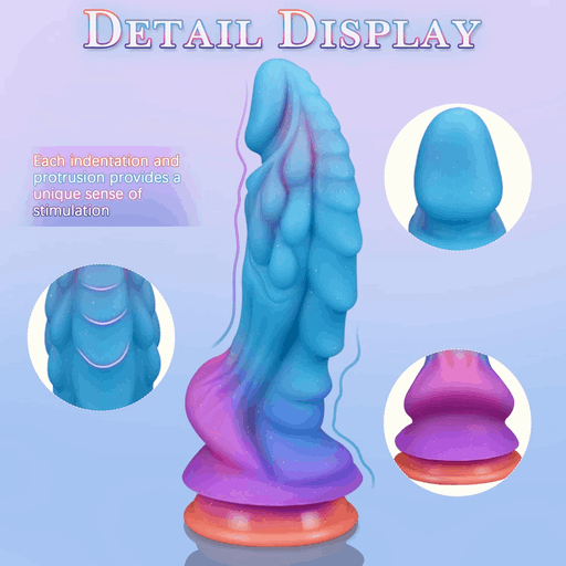 Форма напоминает причудливую скульптуру с волнистой, рельефной поверхностью: извилистые выступы и впадины, будто следы космических приливов, чередуются, создавая игру света и тени. Цветовой переход от глубокого синего к пурпурному с ярко-оранжевой основой у основания добавляет облику характер — одновременно романтично и чуточку безумно, как свидание на чужой планете. Основание выполнено в виде надёжной присоски с контрастной оранжевой каймой — чтобы ваша межзвёздная интрига оставалась на месте даже при самых прыжковых эмоциях.