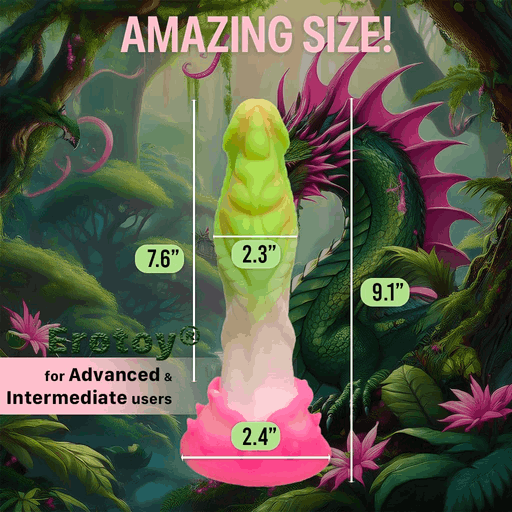 Цветовой переход от яркого салатового к розовому напоминает закат на чужой планете: веселый градиент, который сразу настраивает на игру. Форма — полная характерных акцентов: округлая головка, аккуратные рельефы и «чешуйчатая» фактура у основания, которая выглядит как каменная платформа дракона. Основание широкое и устойчивое, с присоской, позволяющей закрепить прибор на ровной поверхности — идеальный вариант для экспериментов «solo or together», как обещает легенда на постере. На фоне изображен величественный дракон, добавляющий романтической эпичности — словно сам Weirdo Sex Dragon прислал весточку из своих владений.