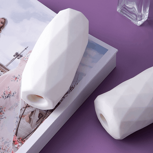 Корпус — белоснежный, матовый, с фасеточной фактурой, напоминающей огранённый камень: грани ритмично перебегают по поверхности, создавая ощущение игры света и тени. Форма цилиндрическая, слегка утолщённая в середине для удобного захвата: держать его — одно удовольствие, как будто в руке оказался аккуратный бриллиант с характером. Внутренняя часть — контраст: мягкая кишка с выразительным рельефом — череда округлых выступов и более крупных лепестков, которые словно сговорились устроить мини-танец для чувств; в средней части канал слегка сужается, образуя уютное «гнёздышко» для центральных ласк. Края входного отверстия аккуратно оформлены, без резких кромок, что делает прикосновения нежными и безопасными.